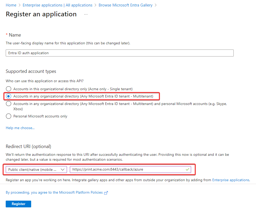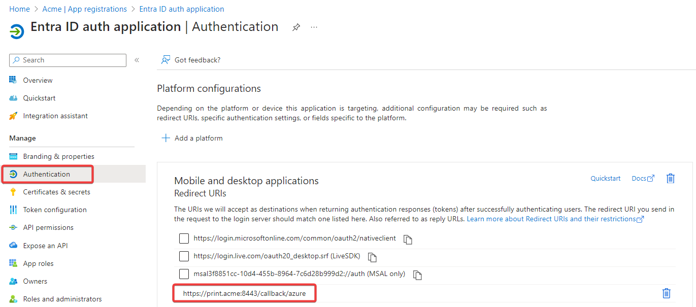 https://<domain:port>/callback/azure. The domain and the port should be the same as the ones of the Dispatcher Paragon Cloud website URL. For example, if the Dispatcher Paragon Cloud web URL ishttps://print.acme.com:8443,the value should be:https://print.acme.com:8443/callback/azure.In environments with reverse proxy infrastructure, do not specify the port number in the URL, meaning the default HTTPS port 443 will be used. Example: