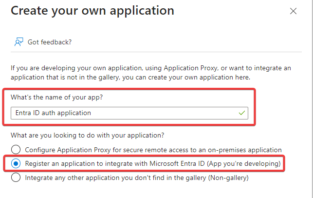 Name your application, select Register an application to integrate with Microsoft Entra ID (App you're developing), and click Create.