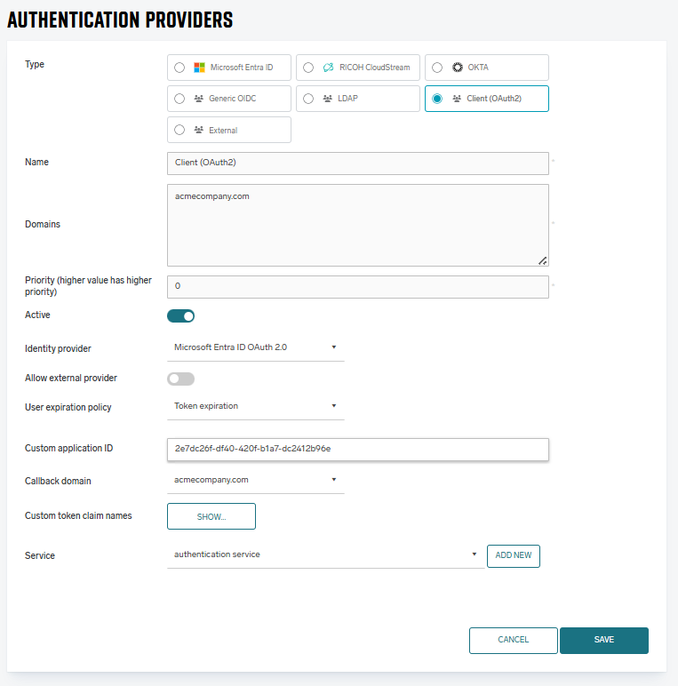 In Name, enter the name of the authentication service. Should be prefilled with the selected Type.