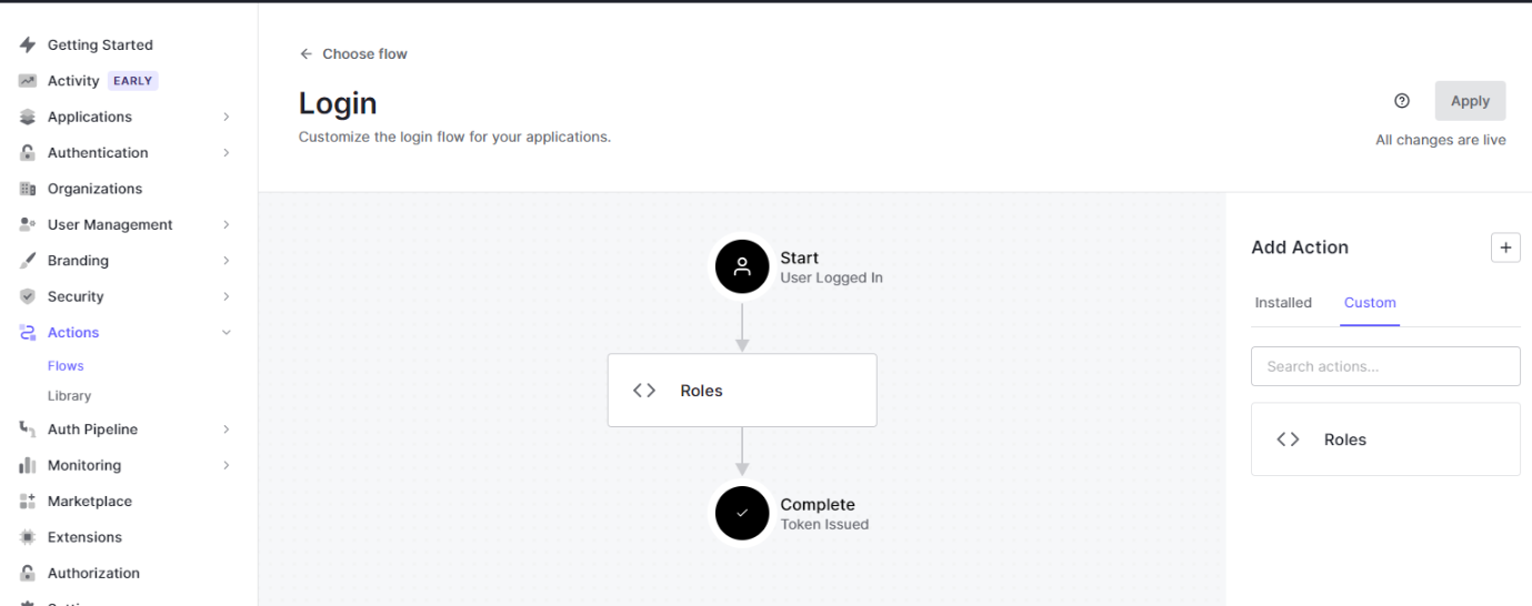 JSexports.onExecutePostLogin = async (event, api) => { const namespace = 'Dispatcher Paragon Cloud'; if (event.authorization) { api.idToken.setCustomClaim(`${namespace}/roles`, event.authorization.roles); api.accessToken.setCustomClaim(`${namespace}/roles`, event.authorization.roles); } };Go to Actions > Flows > Login.