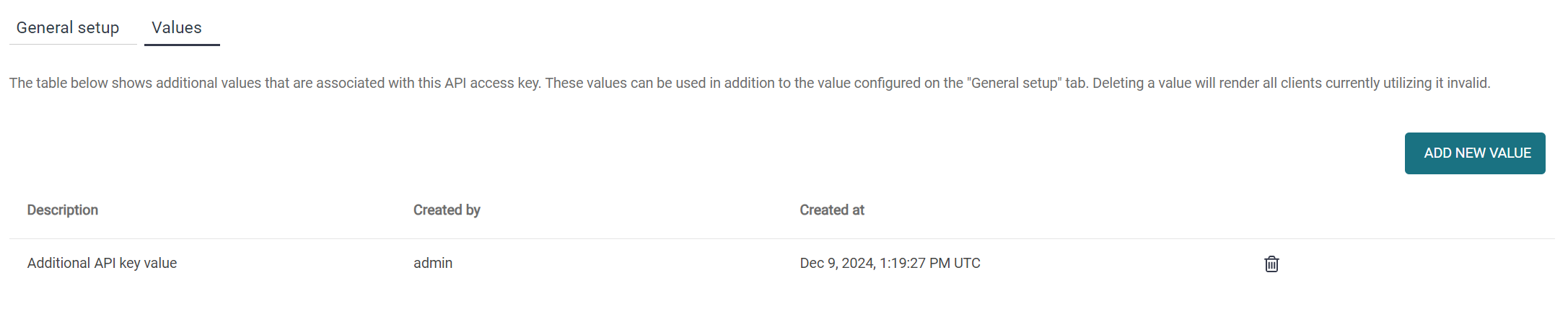 Value – an automatically generated unique value associated with the API key.