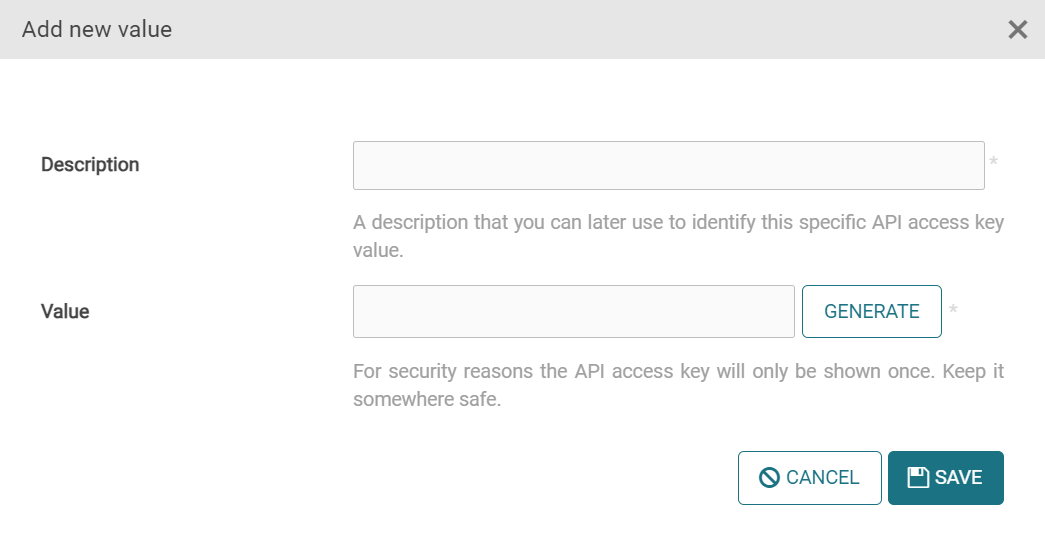 In the Description field, enter a description that you can later use to identify this specific API access key value.