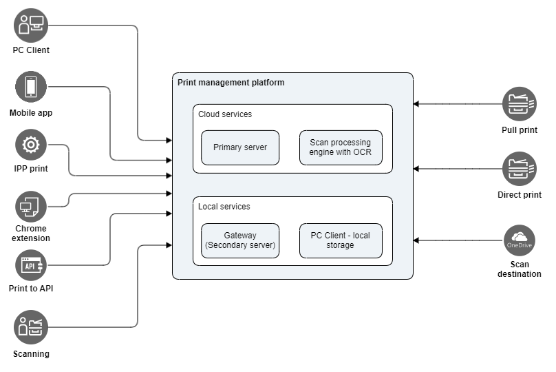 Gateways allow document storage and processing to remain local, ensuring document integrity and privacy are maintained. Only the print job’s selected metadata are transferred to the cloud for management and reporting purposes via an encrypted channel. Document content remains secure because it never leaves your premises and thus never reaches cloud components. Data that are not present in the cloud cannot be externally compromised.
