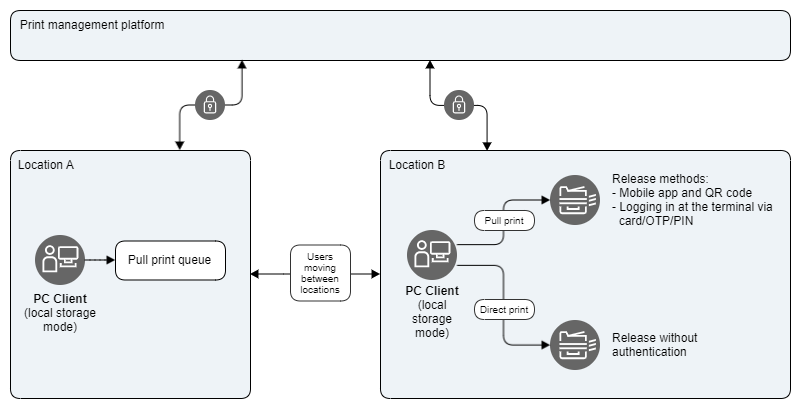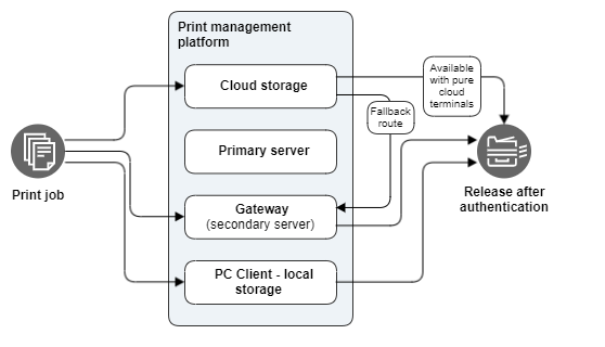 Print jobs are routed through Cloud servers or using the Dispatcher Paragon Cloud Client with local storage.