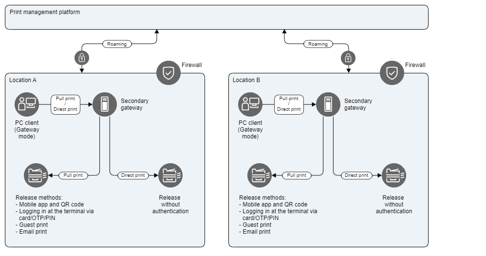 Dispatcher Paragon Cloud Client using gateway storage and connected to the secondary server (this scenario is not captured in the diagram schematics) – this setup may be useful if you want your devices to only accept print jobs coming from the Gateway. For example, for compliance reasons.