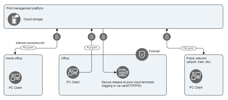 Pull print with embedded terminal (Also known as Print Roaming) | In this scenario, users send a print job to Dispatcher Paragon Cloud and authenticate at any connected MFD to release it. The MFD has an embedded terminal (client) deployed. |