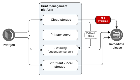 For the fallback route to work, when the primary server is in the cloud and a document is printed from a secondary server in the local network, storage services must be enabled on both primary and secondary servers.