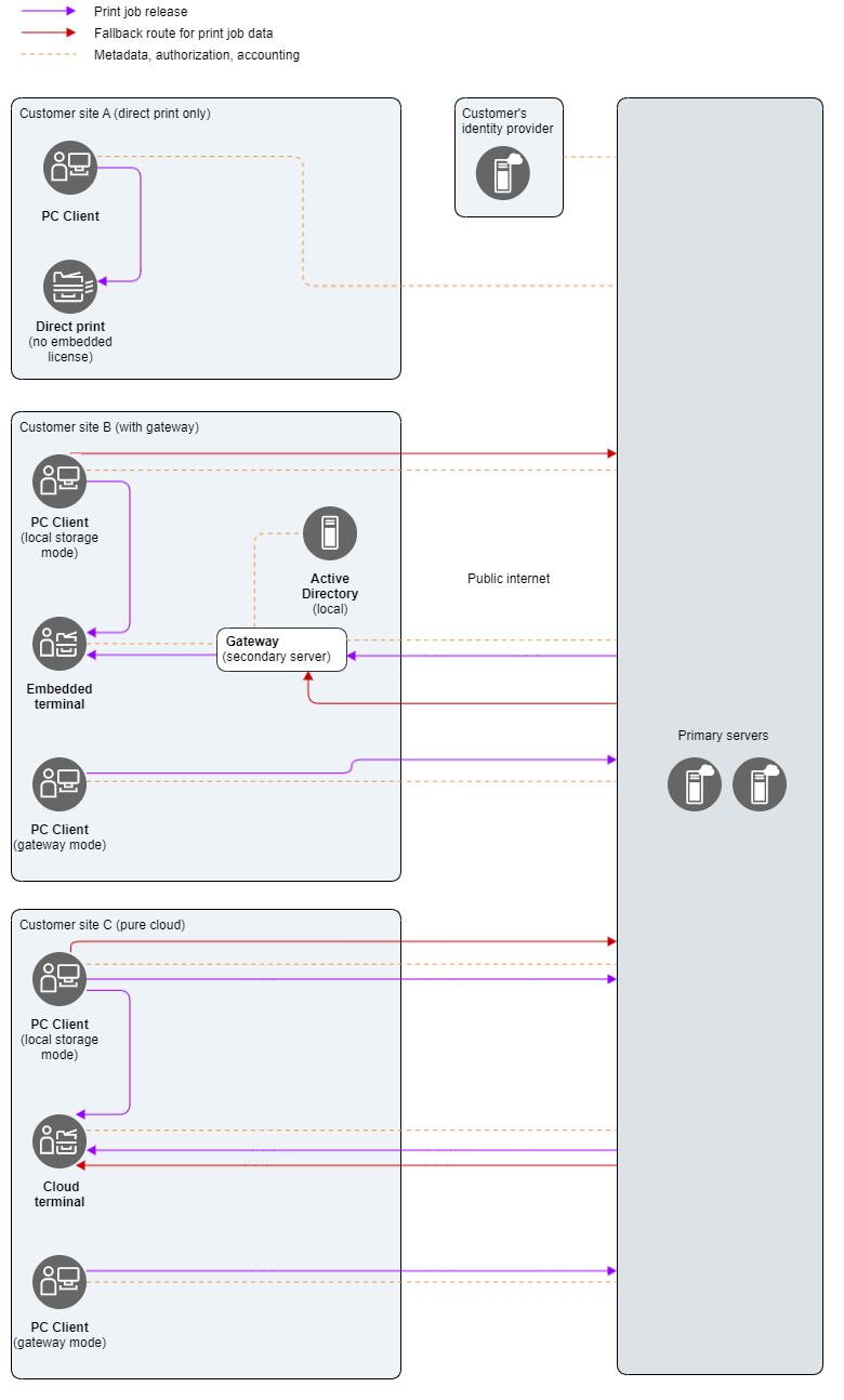 Feature | Description | Customer site A (direct print only, no embedded MFD license) | Customer site B (with gateway) | Customer site C (pure cloud) |