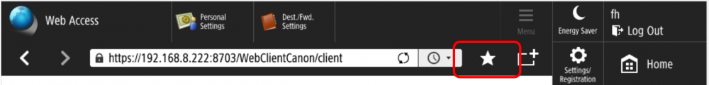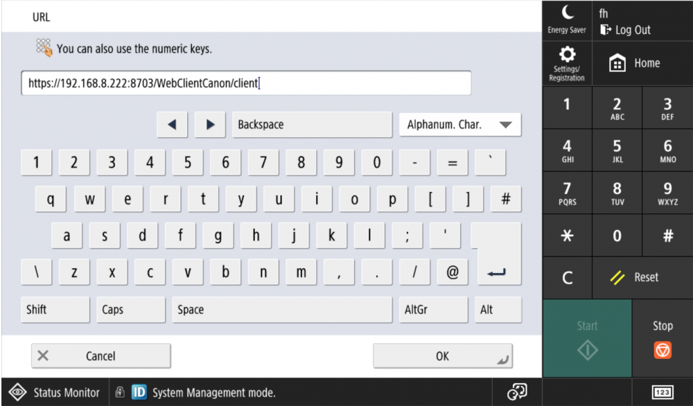 On the device, open “Web Access” browser and enter the following address (take care as it is case sensitive), and afterwards click “OK”: https://[SERVER-ADDRESS]:8703/WebClientCanon/client or https://[SERVER-ADDRESS]:8703/WebClientCanon/client?addr=hostname for the DNS setup