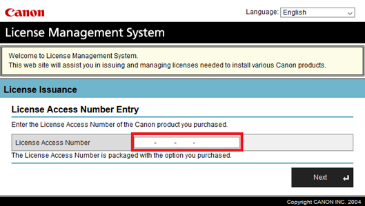 Enter the License Access Number provided in the downloaded text file, then press ‘Next’:
