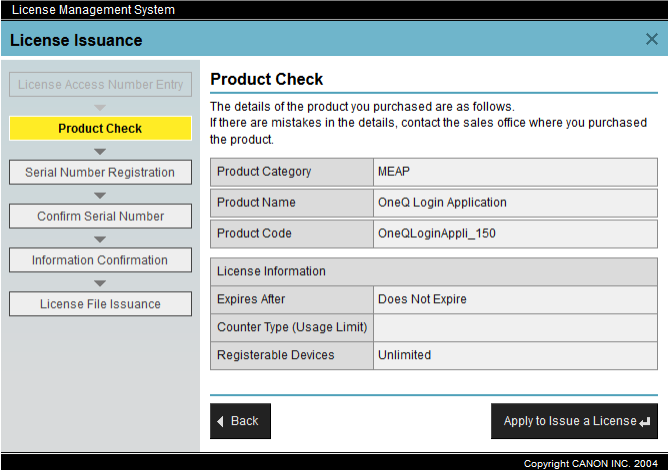 Review the information on the Product Check page, then press ‘Apply to Issue a License’: