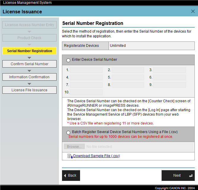 To generate the license file, we need to follow the steps and instructions available on the Canon website for the License Management System.