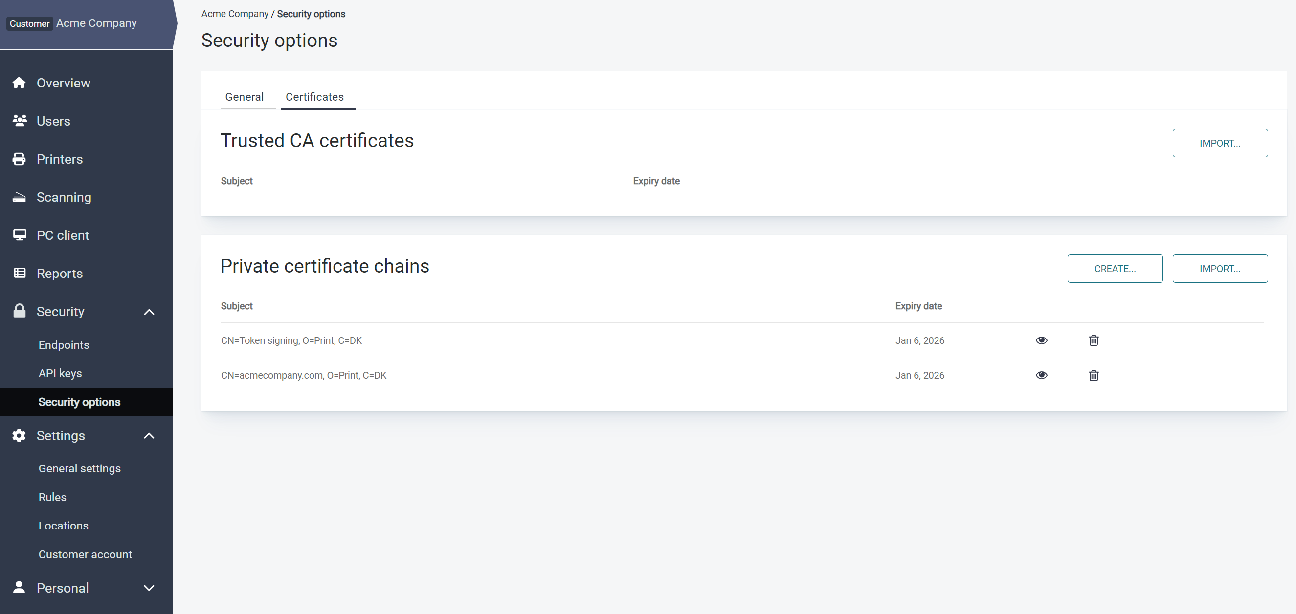 The Certificates tab allows you to import or create valid SSL certificates for a Vendor or Customer account for use in the various interfaces, including Dispatcher Paragon Cloud Web UI, APIs, IPP print, and embedded terminal communications.