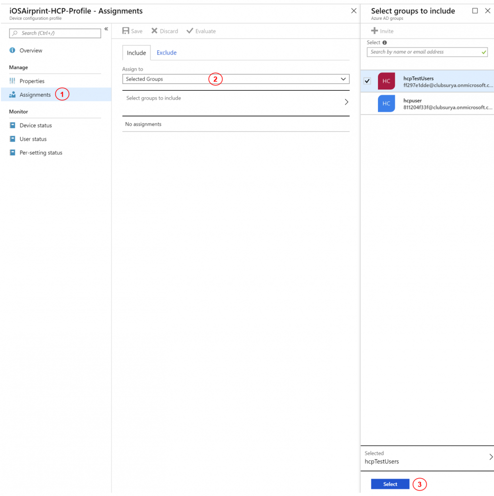 Choose ‘Selected Groups’ from ‘Assign to’ dropdown and select relevant groups for assignment. Other options available are – ‘All Users and All Devices’, ‘All Devices’ and ‘All Users’