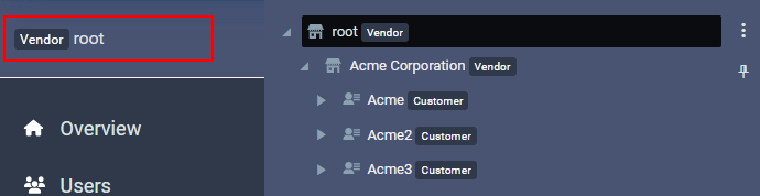 Vendor administrators can navigate between individual customer tenants by hovering over the name of their vendor account in the navigation menu. This will display the Dispatcher Paragon Cloud system tree. Once you click the customer tenant name in the right part of the tree, the left part of the menu will display information related to that customer, and the right part will be hidden until you hover over the top of the menu again.