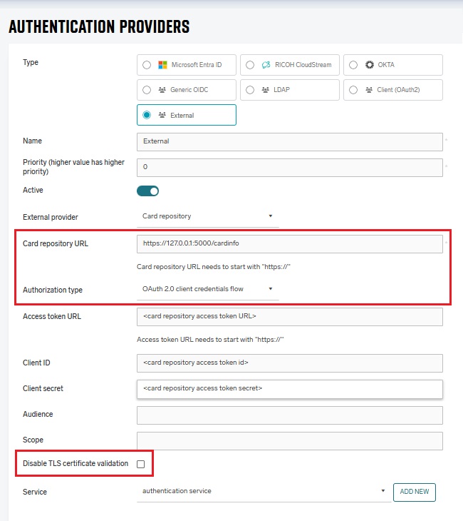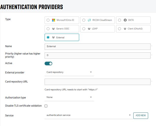 Dispatcher Paragon Cloud supports external authentication provider where external authentication service such as External Card Repository is used to identify users from different authentication providers. For more details on how a specific external provider works, see the documentation section dedicated to that external provider.
