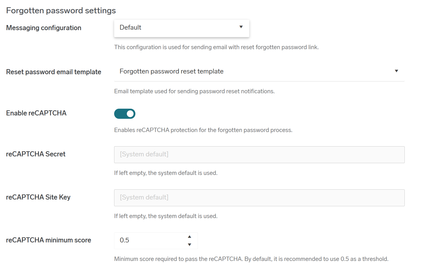 In the Forgotten password section you can setup messaging configuration and reCaptcha settings of forgotten password feature.