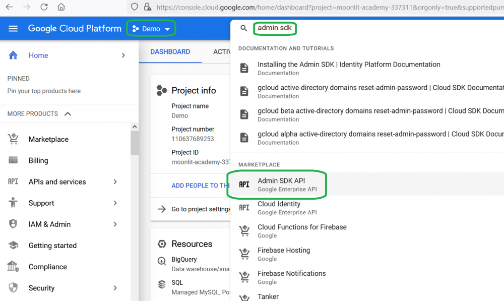 Check if Admin SDK API is enabled for your project, and if it’s not, enable it: choose your project and type in the search line “admin sdk”