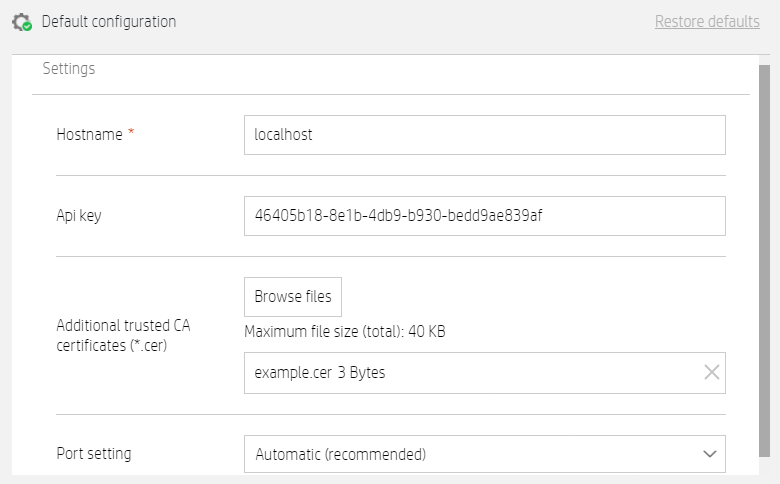 Additional trusted CA certificates – If the specified hostname does not provide a HTTPS certificate issued by a globally trusted Certification Authority, additional trusted certificates can be specified here. See the following section for details.