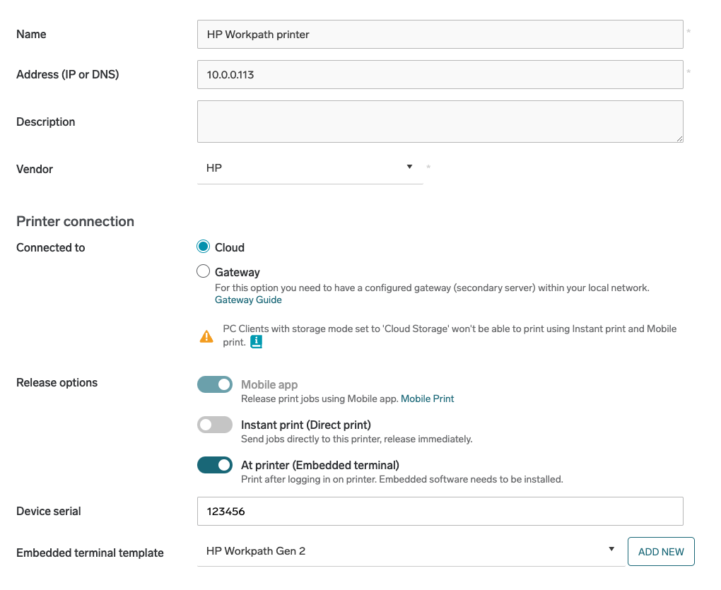 Adding HP Workpath printer and Embedded configuration in Dispatcher Paragon Cloud Web UI