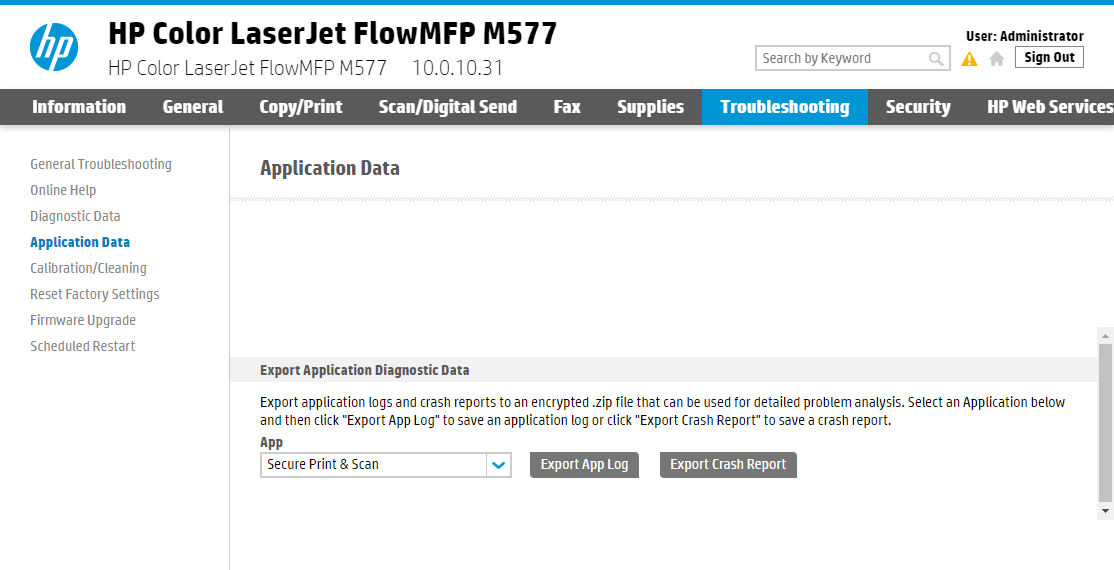 Log in to MFD's web administration interface and navigate to Troubleshooting > Application Data.