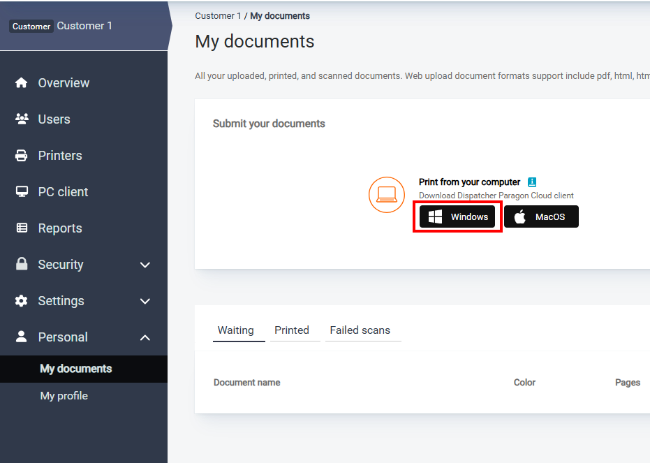 Log in to your Web UI, navigate to Personal > My documents, and select Windows.