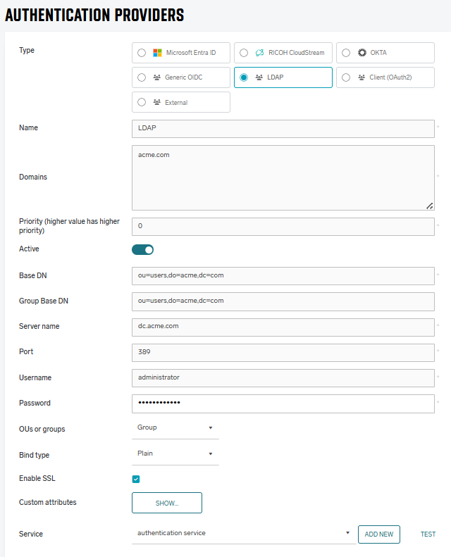 - Active – If enabled, this authentication provider will be used for authentication. If disabled, this authentication provider will not be searched.