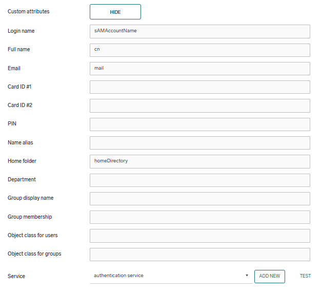 - Custom attributes – Expand custom attributes to change the LDAP attributes in which username, card ID’s, ShortID’s and similar are stored.