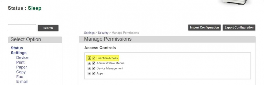 Open MFD´s Web-interface in a browser and navigate through “Settings”, “Security”, “Security Setup”, “Access Controls”.