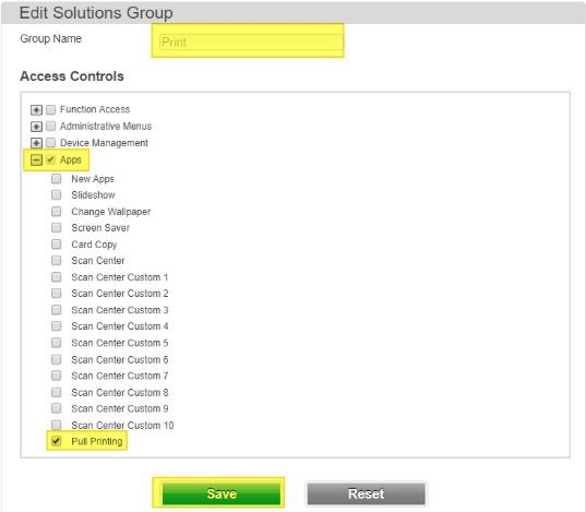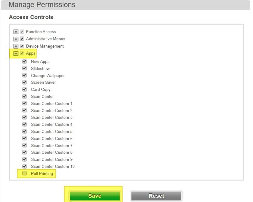 For the Print, select Pull printing under Apps and select Save