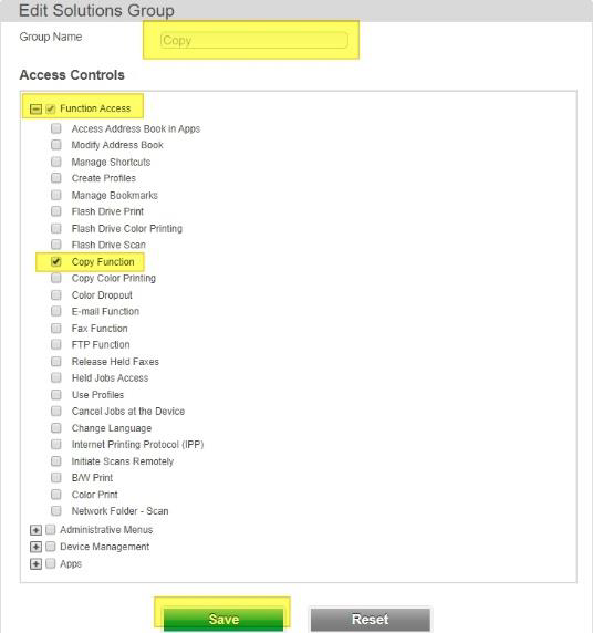 For the Color Copy, select Copy Function and Color copy Printing under Function Access and select Save