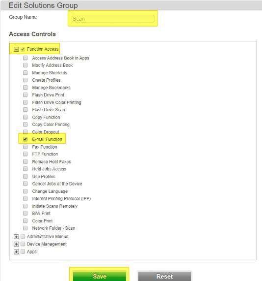 For the Scan, select E-mail Function under Function Access and select Save