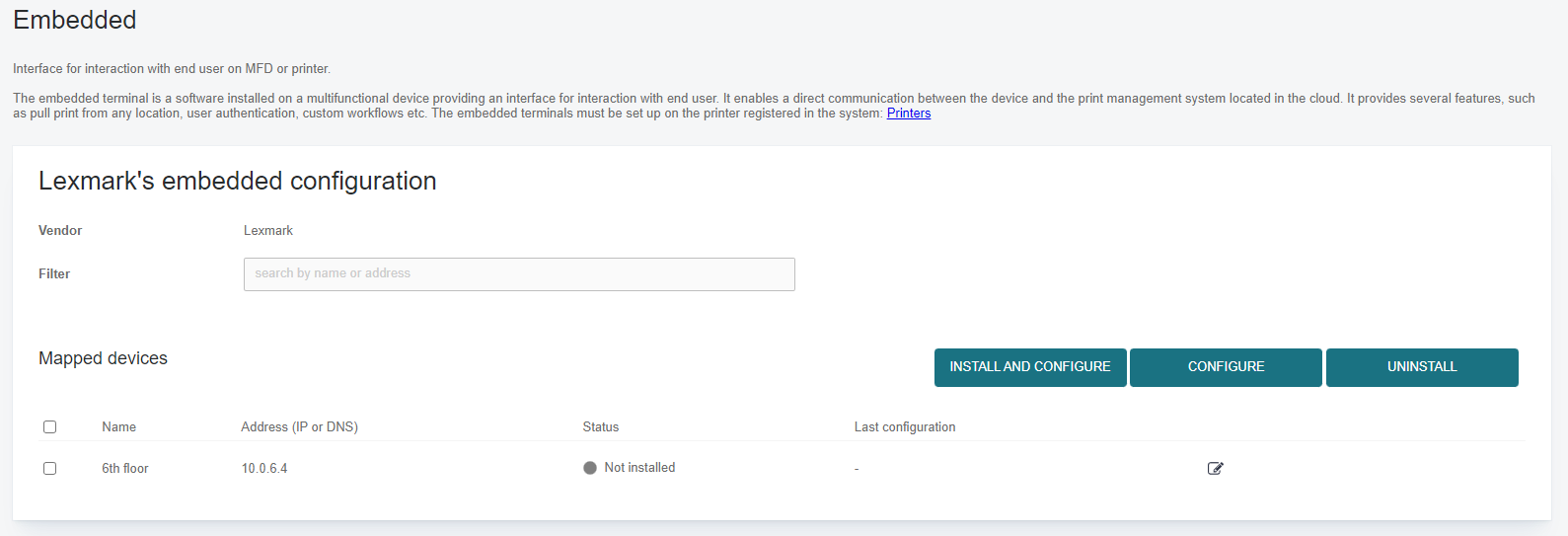 After setting up the printer on the network and configuring in Dispatcher Paragon Cloud, push out the Embedded configuration from embedded screen found in Dispatcher Paragon Cloud Web UI Printers > Embedded templates tab and clicking deployment action icon.