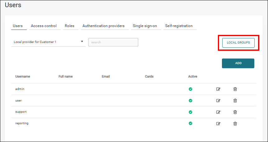 For local authentication provider, it is possible to define custom local groups and to edit the user membership for these groups. When you select a local authentication provider in the Users tab, you will see the Local groups button.