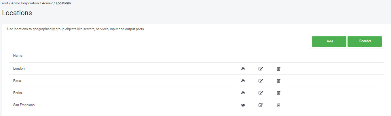 List view of all locations with navigation to reorder, add, view associated objects, edit, and delete.
