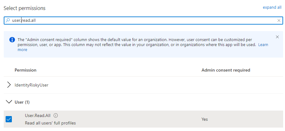 User.Read.All – Allows the app to read the full set of profile properties, reports, and managers of other users in your organization on behalf of the signed-in user.