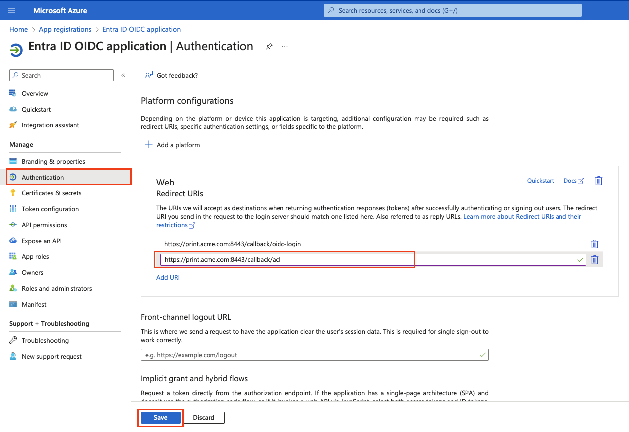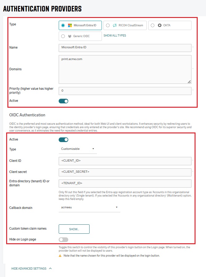 Callback domain for custom application – Select from the list of available domains the one that you defined in Azure App registration as Redirect URI in previous steps, e.g. print.acme.com .