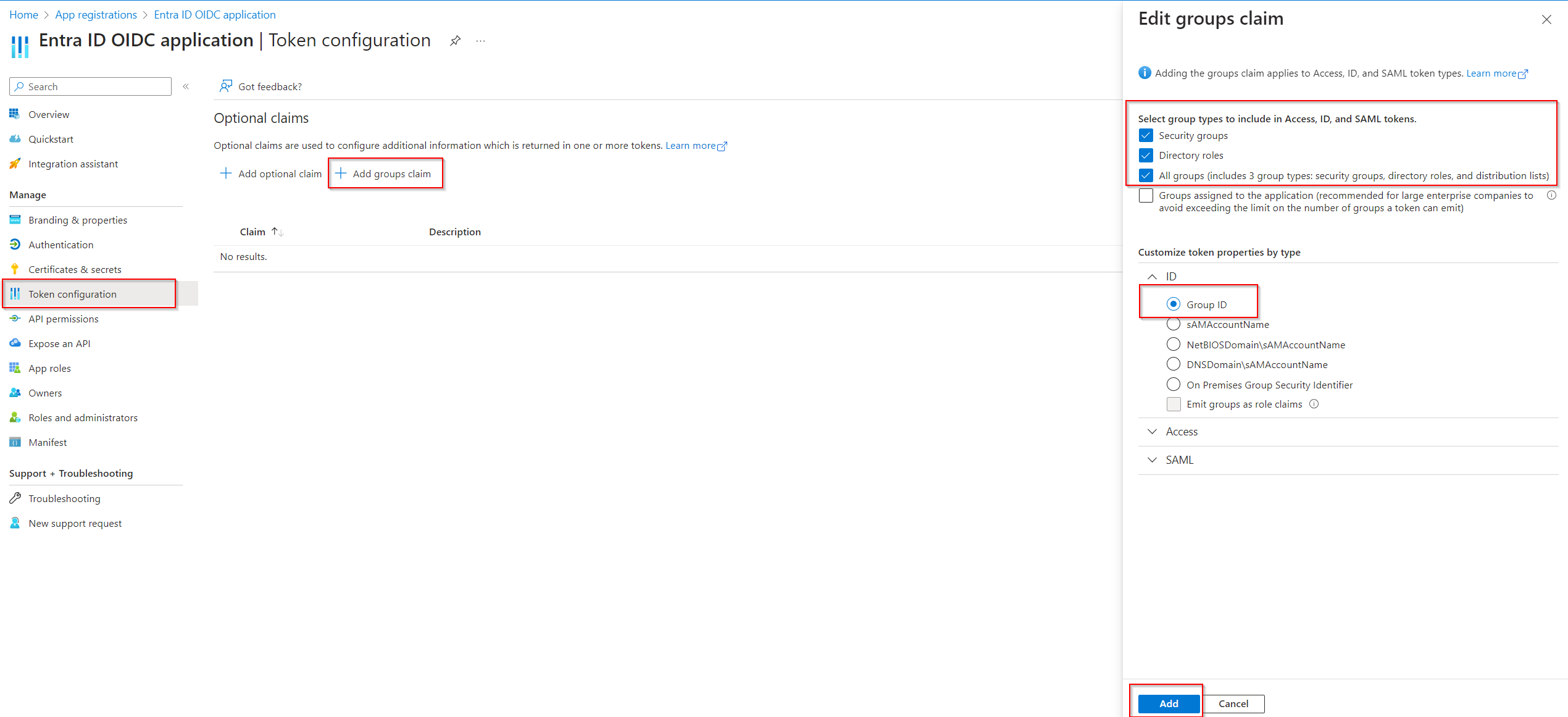 Go to Token configuration, click + Add groups claim, and define the groups that will be part of the users' ID Token. This will be used later in the Access Control configuration in Dispatcher Paragon Cloud.