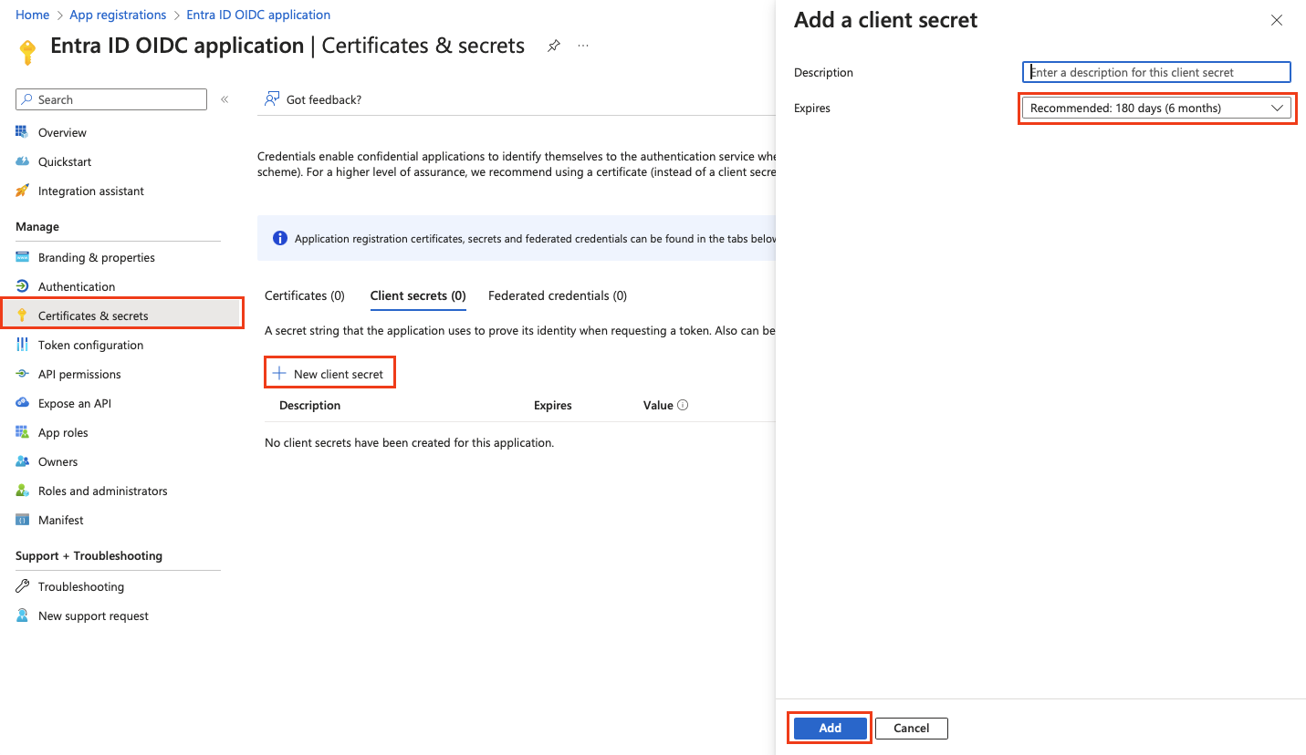 Go to Certificates & secrets and click + New client secret. Optionally, set the Expires value according to your security policy. Click Add.
