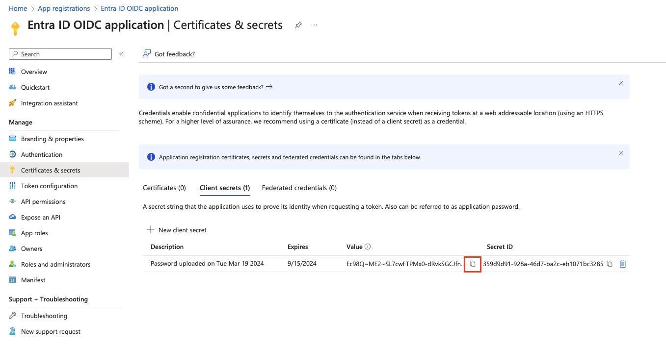 The result will look like this. Microsoft Entra ID app configuration for OIDC authentication is now finished.