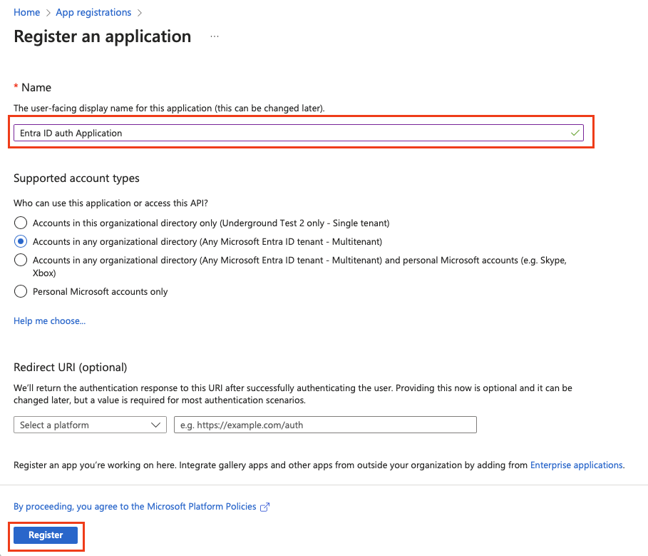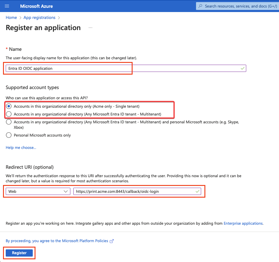 Enter your new application's name, choose Single tenant (Accounts in this organizational directory only) or Multitenant (Accounts in any organizational directory) account type. However, we recommend Single tenant. Fill in the Redirect URI field. The Redirect URI pattern is: https://<account-domain>:<port>/callback/oidc-login
