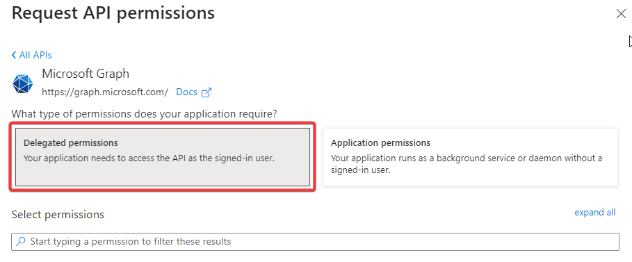 Select Microsoft Graph from Commonly used Microsoft APIs.
