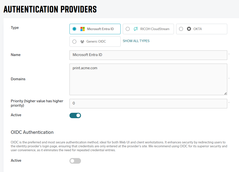 Active – If enabled, the authentication provider will be used for authentication. If disabled, this authentication provider will not be used for authentication. You can use this to disable the Authentication provider temporarily.