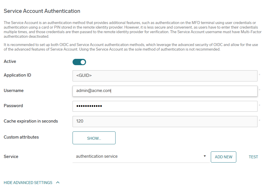 OIDC Built-in authentication together with Service account authentication – Choose this option if you have card IDs and/or PINs stored in your authentication provider and you wish the users to be able to log in with cards or PINs at the MFDs.