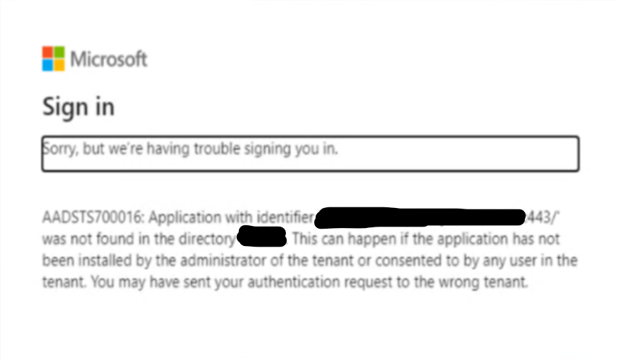 You get the following message from Microsoft, saying "Application with identifier 'https://[domain_name]:443/' was not found in the directory...":