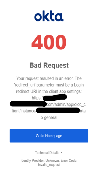 You get the following message from Okta saying: "The 'redirect_uri' parameter must be a Login redirect URI in the client app settings...":