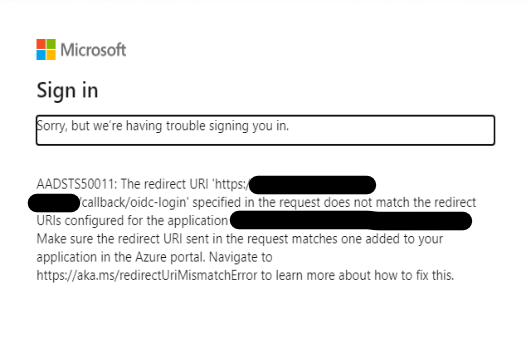 You get the following message from Microsoft, saying "The redirect URI 'https://[domain_name]/callback/oidc-login' specified in the request does not match the redirect URIs configured for the application...":