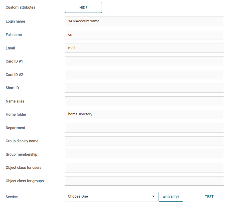 Custom attributes – Expand custom attributes to change the LDAP attributes in which username, card ID’s, ShortID’s and similar are stored. The login name and email must have “uid” value.