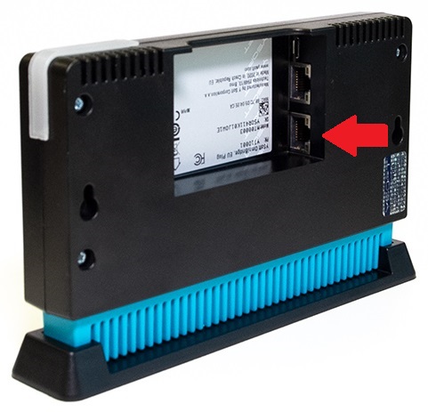Plug the power cable into the power port and then connect the power adapter to a power outlet. The YSoft OMNI Bridge will start to initialize. The display will show DEVICE STATUS: STARTING, and the LED light will turn yellow.