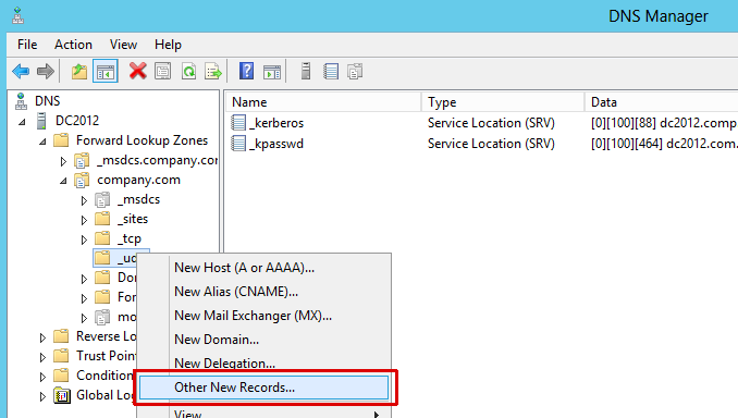 - Under the domain (in this case company.com) right-click on _udp and select Other new records.